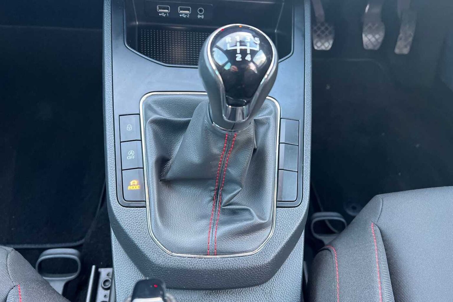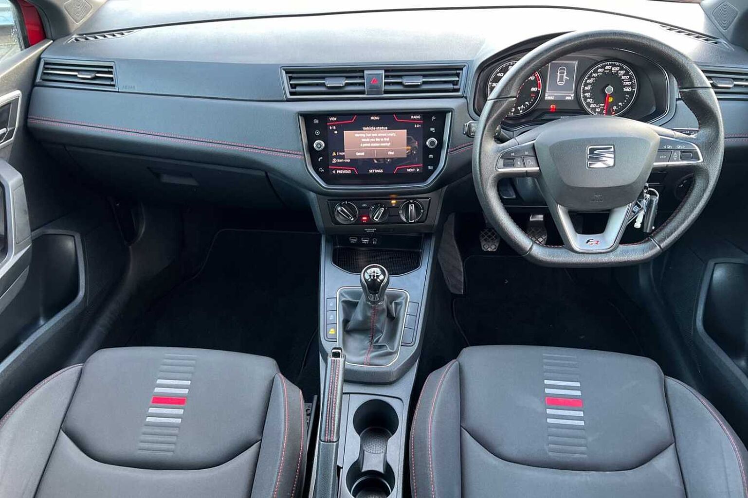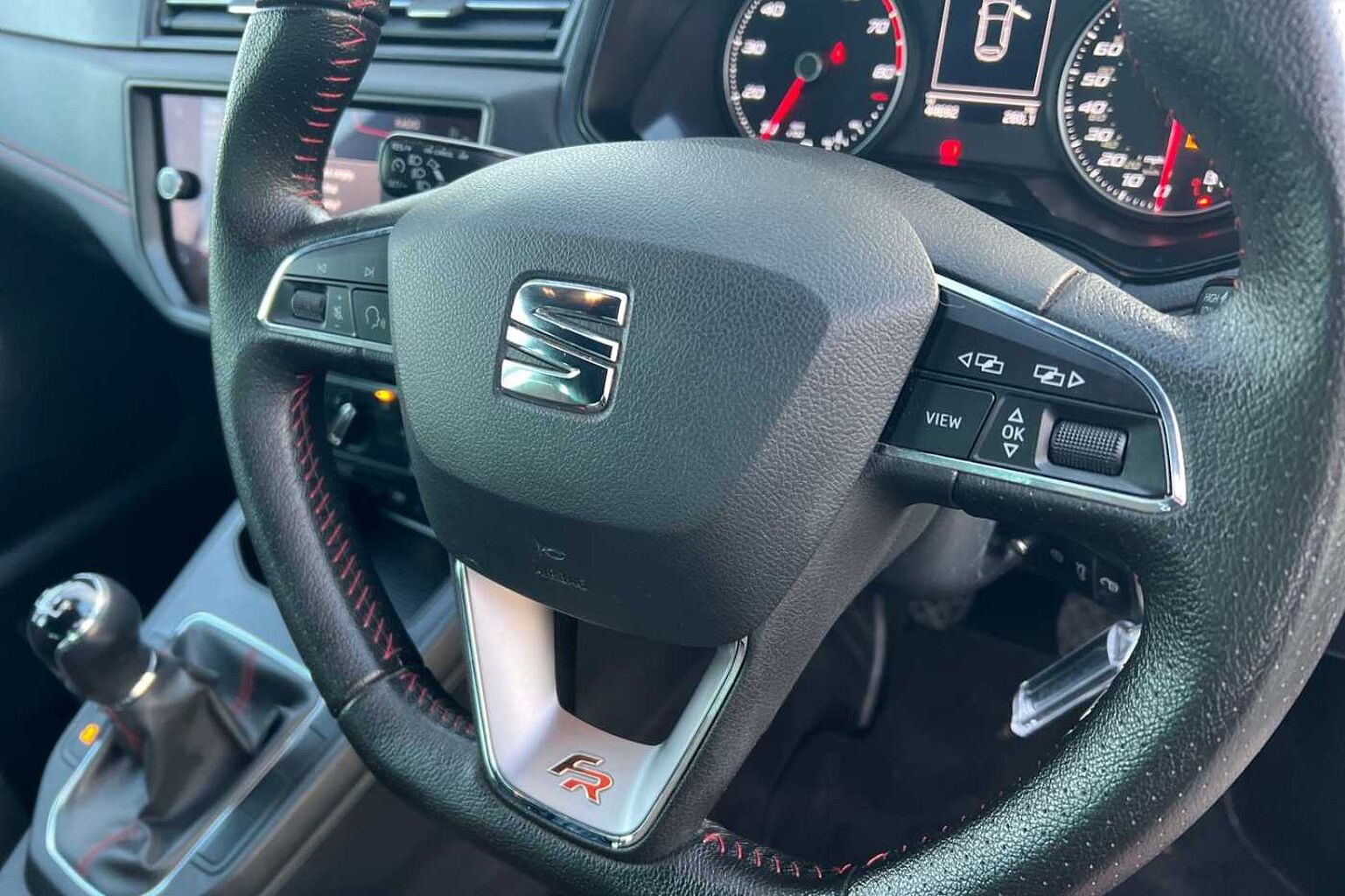 • Flat bottomed perforated leather steering wheel with red stitching and FR logo